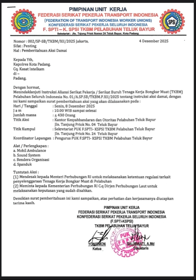 Artikel ini disusun berdasarkan dokumen resmi pemberitahuan aksi damai PUK F SPTI–KSPSI TKBM Pelabuhan Teluk Bayur per 4 Desember 2025.